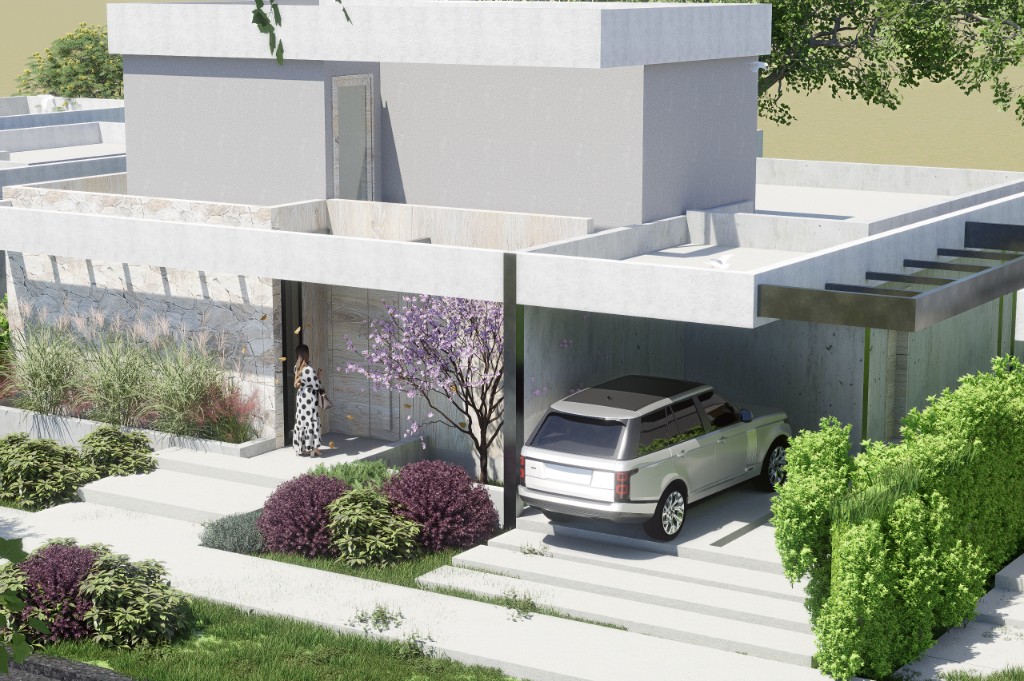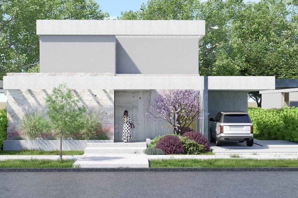 La propuesta plantea una envolvente limpia, casi monolítica, donde la ausencia de carpinterías visibles refuerza la idea de refugio y privacidad. La puerta principal se integra a la materialidad del muro y se mimetiza con el conjunto, generando una lectura continua y serena. La composición se apoya en la combinación de piedra natural, madera y hormigón, logrando un equilibrio entre calidez y solidez constructiva.